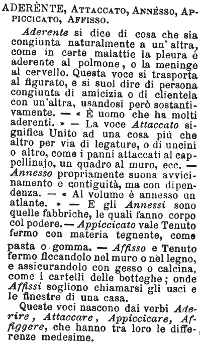 | Aderente, Attaccato, Annesso, Appiccicato, Affisso - Aderente si dice di cosa che sia congiunta naturalmente a un'altra, come in certe malattie la pleura è aderente al polmone, o la meninge al cervello. Questa voce si trasporta al figurato, e si suol dire di persona congiunta di amicizia o di clientela con un'altra, usandosi però sostantivamente. - «E' uomo che ha molti aderenti.» - La voce Attaccato significa Unito ad una cosa più che altro per via di legature, o di uncini o altro, come i panni attaccati al cappellinajo, un quadro al muro, ecc. - Annesso propriamente suona avvicinamento e contiguità, ma con dipendenza. - «Al volume è annesso un atlante.» - E gli Annessi sono quelle fabbriche, le quali fanno corpo col podere. - Appiccicato vale Tenuto fermo con materia tegnente, come pasta o gomma. - Affisso e Tenuto fermo ficcandolo nel muro o nel legno, e assicurandolo con gesso o calcina, come i cartelli delle botteghe; onde Affissi sogliono chiamarsi gli usci e le finestre di una casa.