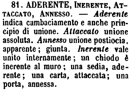 | Aderente, Inerente, Attaccato, Annesso - Aderente indica cambaciamento e anche principio di unione. Attaccato unione assoluta. Annesso unione posticcia, apparente; giunta. Inerente vale unito internamente; un chiodo è inerente al muro; una sedia, aderente; una carta, attaccata; una porta, annessa. [immagine] |