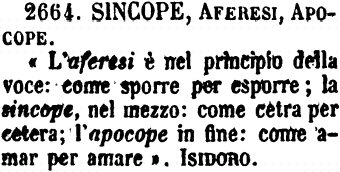 | Aferesi, Apocope, Sincope, Accorciamento - Molti giovani confondono queste figure grammaticali, massimamente le prime due. Si ricorda dunque che Aferesi è nel principio della voce, come Sporre per Esporre, Poldo per Leopoldo; Apocope è nel fine come Ca per Casa; Sincope nel mezzo, come Cetra per Cetera; l'Accorciamento è capriccioso, ma si fa nel corpo della voce, e specialmente nei nomi proprii, come Cecco per Francesco, Ciapo per Jacopo, e in questi casi c'è anche scambio di lettere. [immagine] |