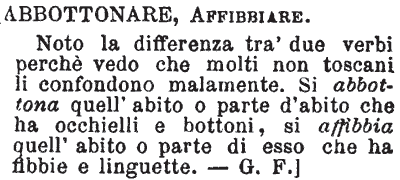 | Abbottonare, Affibbiare - Noto la differenza tra' due verbi perché vedo che molti non toscani li confondono malamente. Si abbottona quell'abito o parte d'abito che ha occhielli e bottoni, si affibbia quell'abito o parte di esso che ha fibbie e linguette. - G. F.] [immagine] |