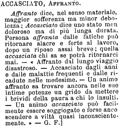 Accasciato, Affranto - Affranto dice, nel senso materiale, maggior sofferenza ma minor debolezza; Accasciato dice uno stato men doloroso ma di più lunga durata. Persona affranta dalle fatiche può ritornare alacre e forte al lavoro, dopo un riposo assai breve; qualla accasciata chi sa se potrà ritornarci mai. - «Affranto dal lungo viaggio disastroso. - Accasciato dagli anni e dalle malattie frequenti e dalle ricadute nelle medesime. - Un animo affranto sa trovare ancora nelle sue intime potenze un grido da mettere i brividi della paura a chi lo insulti. - Un animo accasciato può facilmente essere soggiogato e forse anco scendere a viltà quasi inconscientemente.» - G.F.] [immagine]