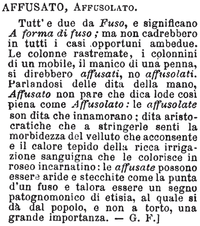 | Affusato, Affusolato - Tutt'e due da Fuso, e significano A forma di fuso; ma non cadrebbero in tutti i casi opportuni ambedue. Le colonne rastremate, i colonnini di un mobile, il manico di una penna, si direbbero affusati, no affusolati. Parlandosi delle dita della mano, Affusato non pare che dica lode così piena come Affusolato: le affusolate son dita che innamorano; dita aristocratiche che a stringerle senti la morbidezza del velluto che acconsente e il calore tepido della ricca irrigazione sanguigna che le colorisce in roseo incarnatino: le affusate possono essere aride e stecchite come la punta d'un fuso e talora essere un segno patognomonico di etisia, al quale si dà dal popolo, e non a torto, una grande importanza. - G. F.] [immagine] |