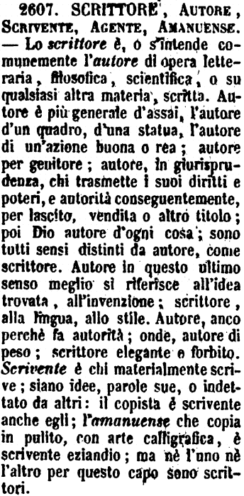 | Scrittore, Autore, Scrivente, Agente, Amanuense - Lo scrittore è, o s'intende comunemente l'autore di opera letteraria, filosofica, scientifica, o su qualsiasi altra materia, scritta. Autore è più generale d'assai, l'autore d'un quadro, d'una statua, l'autore di un'azione buona o rea; autore per genitore; autore, in giurisprudenza, chi trasmette i suoi diritti e poteri, e autorità conseguentemente, per lascito, vendita o altro titolo; poi Dio autore d'ogni cosa; sono tutti sensi distinti da autore, come scrittore. Autore in questo ultimo senso meglio si riferisce all'idea trovata, all'invenzione; scrittore, alla lingua, allo stile. Autore, anco perché fa autorità; onde, autore di peso; scrittore elegante e forbito. Scrivente è chi materialmente scrive; siano idee, parole sue, o indettato da altri: il copista è scrivente anche egli; l'amanuense che copia in pulito, con arte calligrafica, è scrivente eziandio: ma né l'uno né l'altro per questo capo sono scrittori. [immagine] |
