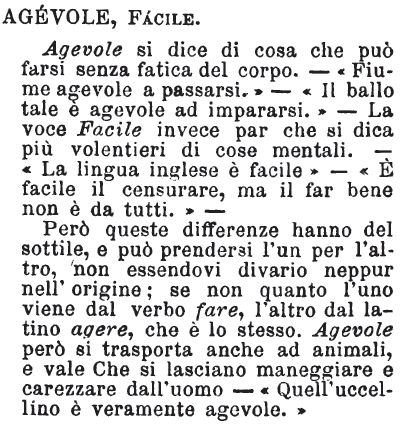 Però queste differenze hanno del sottile, e può prendersi l'un per l'altro, non essendovi divario neppur nell'origine; se non quanto l'uno viene dal verbo fare, l'altro dal latino agere, che è lo stesso. Agevole però si trasporta anche ad animali, e vale Che si lasciano maneggiare e carezzare dall'uomo - «Quell'uccellino è veramente agevole.» [immagine] |