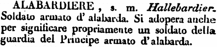 | Alabardiere - s. m. Hallebardier. Soldato armato d'alabarda. Si adopera anche per significare propriamente un soldato della guardia del Principe armato d'alabarda. [immagine] |
