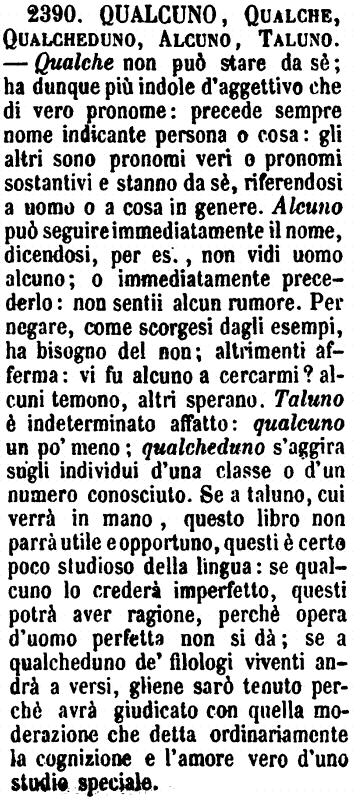 | Qualcuno, Qualche, Qualcheduno, Alcuno, Taluno - Qualche non può stare da sè; ha dunque più indole d'aggettivo che di vero pronome: precede sempre nome indicante persona o cosa: gli altri sono pronomi veri o pronomi sostantivi e stanno da sè, riferendosi a uomo o a cosa in genere. Alcuno può seguire immediatamente il nome, dicendosi, per es., non vidi uomo alcuno; o immediatamente precederlo: non sentii alcun rumore. Per negare, come scorgesi dagli esempi, ha bisogno del non; altrimenti afferma: vi fu alcuno a cercarmi? alcuni temono, altri sperano. Taluno è indeterminato affatto: qualcuno un po' meno; qualcheduno s'aggira sugli individui d'una classe o d'un numero conosciuto. Se a taluno, cui verrà in mano, questo libro non parrà utile e opportuno, questi è certo poco studioso della lingua: se qualcuno lo crederà imperfetto, questi potrà aver ragione, perchè opera d'uomo perfetta non si dà; se a qualcheduno de' filologi viventi andrà a versi, gliene sarò tenuto perchè avrà giudicato con quella moderazione che detta ordinariamente la cognizione e l'amore vero d'uno studio speciale. [immagine] |