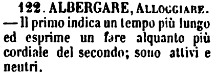 | Albergare, Alloggiare - Il primo indica un tempo più lungo ed esprime un fare alquanto più cordiale del secondo; sono attivi e neutri. [immagine] |