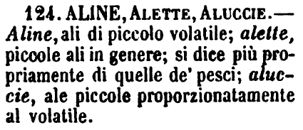 | Aline, Alette, Aluccie - Aline, ali di piccolo volatile; alette, piccole ali in genere; si dice più propriamente di quelle de' pesci; aluccie, ale piccole proporzionatamente al volatile. [immagine] |