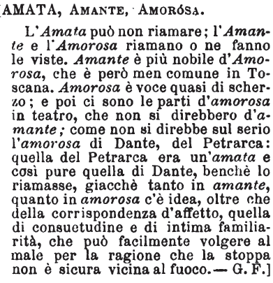 | Amica, Amante, Amata, Amatrice - «Amica, ove non si tratti di semplice amicizia scevra d'amore da donna a uomo, ha quasi sempre mal senso; più dichiaratamente lo ha se è preceduto dall'articolo. Amante può avere senso innocentissimo, esprime la semplice idea di persona che ama. Amata ognun sente ch'esprime l'amore portato alla donna dall'uomo. Converrebbe dire l'amata di Petrarca; l'amante di Leandro; l'amica di Raffaello». Tommaseo [immagine] |