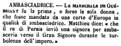 | Ambasciadrice - La marechale de Guèbriant fu la prima, e forse la sola donna, che fosse mandata da una corte d'Europa in qualità di ambasciadrice. Matthieu dice: « che il re di Persia inviò una signora per ambasceria verso il Gran Signore durante le turbolenze dell'impero. » [immagine] |