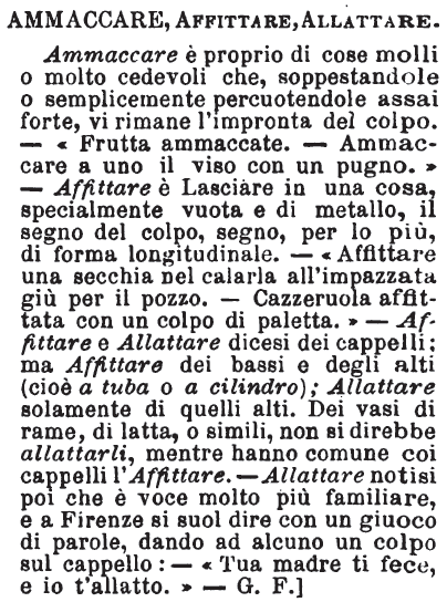| Ammaccare, Affittare, Allattare - Ammaccare è proprio di cose molli o molto cedevoli che, soppestandole o semplicemente percuotendole assai forte, vi rimane l'impronta del colpo. - « Frutta ammaccate. - Ammaccare a uno il viso con un pugno. » - Affittare è Lasciare in una cosa, specialmente vuota e di metallo, il segno del colpo, segno, per lo più, di forma longitudinale. - « Affittare una secchia nel calarla all'impazzata giù per il pozzo. - Cazzeruola affittata con un colpo di paletta. » - Affittare e Allattare dicesi dei cappelli: ma Affittare dei bassi e degli alti (cioè a tuba o a cilindro); Allattare solamente di quelli alti. Dei vasi di rame, di latta, o simili, non si direbbe allattarli, mentre hanno comune coi cappelli l'Affittare. - Allattare notisi poi che è voce molto più familiare, e a Firenze si suol dire con un giuoco di parole, dando ad alcuno un colpo sul cappello: - «Tua madre ti fece, e io t'allatto. » - G. F.] [immagine] |