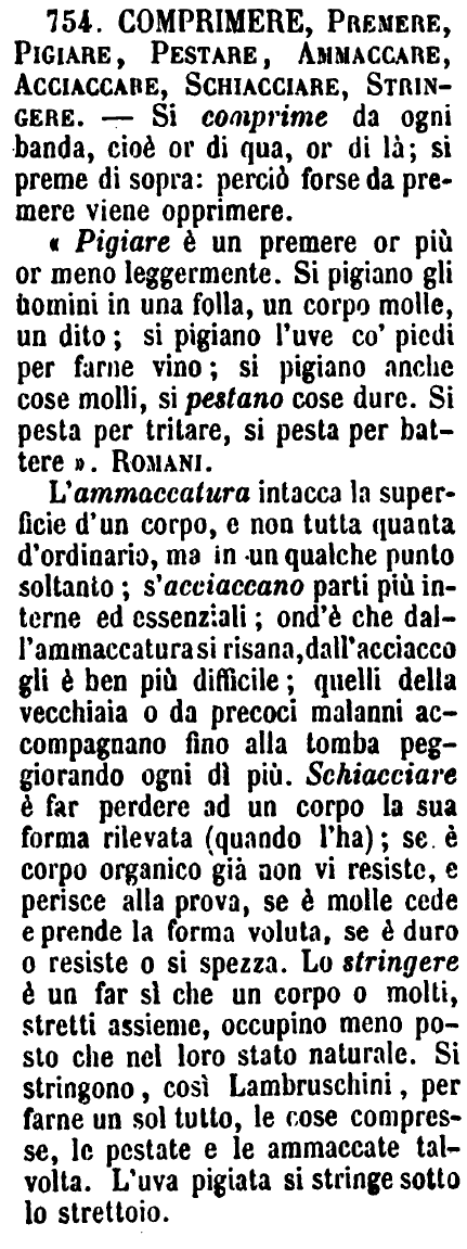 L'ammaccatura intacca la superficie d'un corpo, e non tutta quanta d'ordinario, ma in un qualche punto soltanto; s'acciaccano parti più interne ed essenziali; ond'è che dall'ammaccatura si risana, dall'acciacco gli è ben più difficile; quelli della vecchiaia o da precoci malanni accompagnano fino alla tomba peggiorando ogni dì più. Schiacciare è far perdere ad un corpo la sua forma rilevata (quando l'ha); se è corpo organico già non vi resiste, e perisce alla prova, se è molle cede e prende la forma voluta, se è duro o resiste o si spezza. Lo stringere è un far sì che un corpo o molti, stretti assieme, occupino meno posto che nel loro stato naturale. Si stringono, così Lambruschini, per farne un sol tutto, le cose compresse, le pestate e le ammaccate talvolta. L'uva pigiata si stringe sotto lo strettoio. [immagine] |