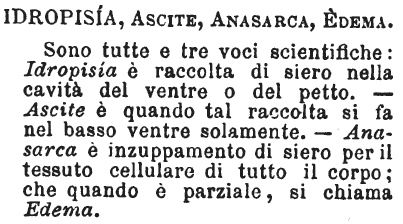 | Idropisia, Ascite, Anasarca, Edema - Sono tutte e tre voci scientifiche: Idropisìa è raccolta di siero nella cavità del ventre o del petto. - Ascite è quando tal raccolta si fa nel basso ventre solamente. - Anasarca è inzuppamento di siero per il tessuto cellulare di tutto il corpo; che quando è parziale, si chiama Edema. [immagine] |