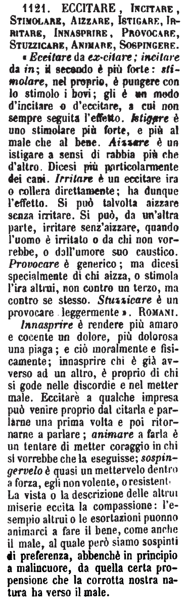 | Eccitare, Incitare, Stimolare, Aizzare, Istigare, Irritare, Innasprire, Provocare, Stuzzicare, Animare, Sospingere - «Eccitare da ex-citare; incitare da in; il secondo è più forte: stimolare, nel proprio, è pungere con lo stimolo i bovi; gli è un modo d'incitare o d'eccitare, a cui non sempre seguita l'effetto. Istigare è uno stimolare più forte, e più al male che al bene. Aizzare è un istigare a sensi di rabbia più che d'altro. Dicesi più particolarmente dei cani. Irritare è un eccitare ira o collera direttamente; ha dunque l'effetto. Si può talvolta aizzare senza irritare. Si può, da un'altra parte, irritare senz'aizzare, quando l'uomo è irritato o da chi non vorrebbe, o dall'umore suo caustico. Provocare è generico; ma dicesi specialmente di chi aizza, o stimola l'ira altrui, non contro un terzo, ma contro se stesso. Stuzzicare è un provocare leggermente». Romani.