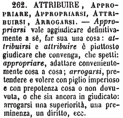 | Attribuire, Appropriare, Appropriarsi, Attribuirsi, Arrogarsi - Appropriarsi vale aggiudicare definitivamente a sè, far sua una cosa: attribuirsi e attribuire è piuttosto giudicare che convenga, che spetti: appropriare, adattare convenientemente cosa a cosa; arrogarsi, pretendere e volere con piglio imperioso e con prepotenza cosa o non dovuta, o che sia ancora in giudicato: arrogarsi una superiorità, una preminenza, un diritto, ecc. [immagine] |