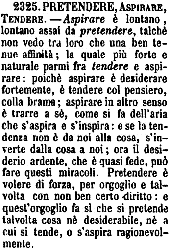 | Pretendere, Aspirare, Tendere - Aspirare è lontano, lontano assai da pretendere, talchè non vedo tra loro che una ben tenue affinità; la quale più forte e naturale parmi fra tendere e aspirare: poichè aspirare è desiderare fortemente, è tendere col pensiero, colla brama; aspirare in altro senso è trarre a sè, come si fa dell'aria che s'aspira e s'inspira: e se la tendenza non è da noi alla cosa, s'inverte dalla cosa a noi; ora il desiderio ardente, che è quasi fede, può fare questi miracoli. Pretendere è volere di forza, per orgoglio e talvolta con non ben certo diritto: e quest'orgoglio fa sì che si pretende talvolta cosa nè desiderabile, nè a cui si tende, o s'aspira ragionevolmente. [immagine] |