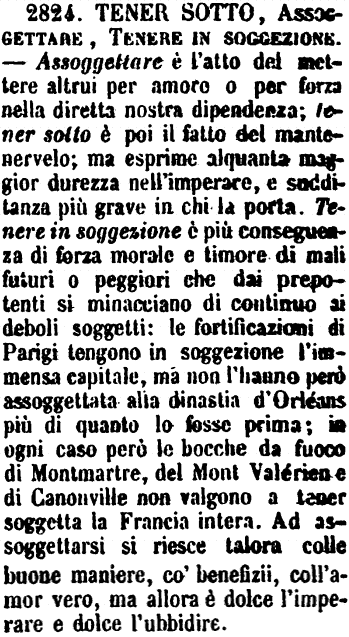 | Tener sotto, Assoggettare, Tenere in soggezione - Assoggettare è l'atto del mettere altrui per amore o per forza nella diretta nostra dipendenza; tener sotto è poi il fatto del mantenervelo; ma esprime alquanta maggior durezza nell'imperare, e sudditanza più grave in chi la porta. Tenere in soggezione è più conseguenza di forza morale e timore di mali futuri o peggiori che dai prepotenti si minacciano di continuo ai deboli soggetti: le fortificazioni di Parigi tengono in soggezione l'immensa capitale, ma non l'hanno però assoggettata alla dinastia d'Orléans più di quanto lo fosse prima; in ogni caso però le bocche da fuoco di Montmartre, del Mont Valérien e di Canouville non valgono a tener soggetta la Francia intera. Ad assoggettarsi si riesce talora colle buone maniere, co' benefizii, coll'amor vero, ma allora è dolce l'imperare e dolce l'ubbidire. [immagine] |
