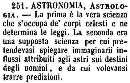 | Astronomia, Astrologia - La prima è la vera scienza che s'occupa de' corpi celesti e ne determina le leggi. La seconda era una supposta scienza per cui pretendevasi spiegare immaginarii influssi attribuiti agli astri sui destini degli uomini, e da cui volevansi trarre predizioni. [immagine] |