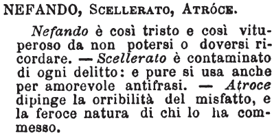 | Nefando, Scellerato, Atroce - Nefando è così tristo e così vituperoso da non potersi o doversi ricordare. - Scellerato è contaminato di ogni delitto: e pure si usa anche per amorevole antifrasi. - Atroce dipinge la orribilità del misfatto e la feroce natura di chi lo ha commesso. [immagine] |