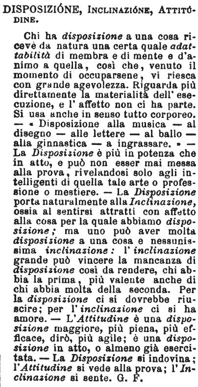 | Propensione, Inclinazione, Disposizione, Attitudine, Pendenza - Attitudine non è più che capacità di ricevere o di fare; disposizione è capacità forse meglio accomodata; per cui la naturale sia coadiuvata dall'arte. La propensione è principio d'inclinazione che è essa stessa una certa pendenza: chi non ha attitudine a un qualche che, non potrà mai avere buona e reale disposizione, per quanto faccia e vi si adoperi. L'attitudine è dello spirito, la disposizione è di questo e del corpo, se al fare occorre; la propensione, l'inclinazione sono più sentimenti del cuore; pendenza è attitudine o disposizione di cosa materiale. [immagine] |