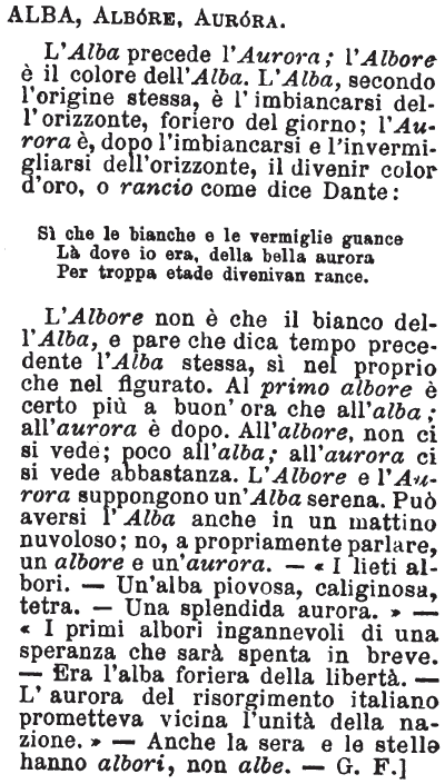 | Alba, Albore, Aurora - L'Alba precede l'Aurora; l'Albore è il colore dell'Alba. L'Alba, secondo l‘origine stessa, è l'imbiancarsi dell'orizzonte, foriero del giorno; l'Aurora è, dopo l'imbiancarsi e l'invermigliarsi dell'orizzonte, il divenir color d'oro, o rancio come dice Dante: