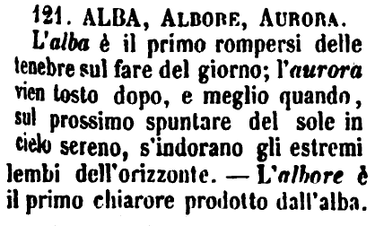 | Alba, Albore, Aurora - L'alba è il primo rompersi delle tenebre sul fare del giorno; l'aurora vien tosto dopo, e meglio quando, sul prossimo spuntare del sole in cielo sereno, s'indorano gli estremi lembi dell'orizzonte. - L'albore è il primo chiarore prodotto dall'alba. [immagine] |