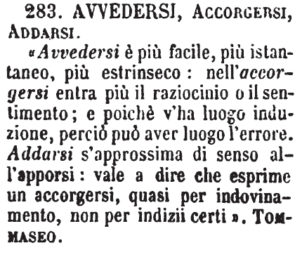 | Avvedersi, Accorgersi, Addarsi - «Avvedersi è più facile, più istantaneo, più estrinseco: nell'accorgersi entra più il raziocinio o il sentimento; e poichè v'ha luogo induzione, perciò può aver luogo l'errore. Addarsi s'approssima di senso all'apporsi: vale a dire che esprime un accorgersi, quasi per indovinamento, non per indizii certi». Tommaseo. [immagine] |