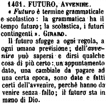 | Futuro, Avvenire - «Futuro è termine grammaticale e scolastico: la grammatica ha il tempo futuro; la scolastica, i futuri contingenti». Girard.