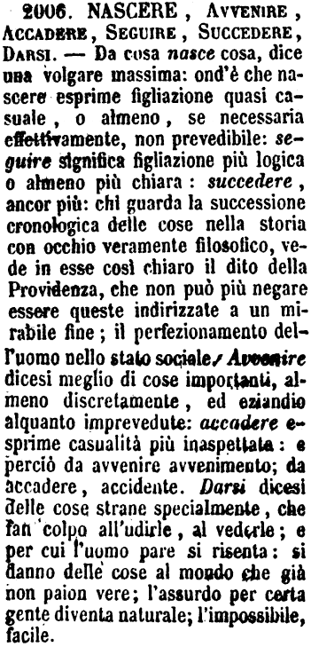 | Nascere, Avvenire, Accadere, Seguire, Succedere, Darsi - Da cosa nasce cosa, dice una volgare massima: ond'è che nascere esprime figliazione quasi casuale, o almeno, se necessaria effettivamente, non prevedibile: seguire significa figliazione più logica o almeno più chiara: succedere, ancor più: chi guarda la successione cronologica delle cose nella storia con occhio veramente filosofico, vede in esse così chiaro il dito della Providenza, che non può più negare essere queste indirizzate a un mirabile fine; il perfezionamento dell'uomo nello stato sociale. Avvenire dicesi meglio di cose importanti, almeno discretamente, ed eziandio alquanto imprevedute: accadere esprime casualità più inaspettata: e perciò da avvenire avvenimento; da accadere, accidente. Darsi dicesi delle cose strane specialmente, che fan colpo all'udirle, al vederle; e per cui l'uomo pare si risenta: si danno delle cose al mondo che già non paion vere; l'assurdo per certa gente diventa naturale; l'impossibile, facile. [immagine] |
