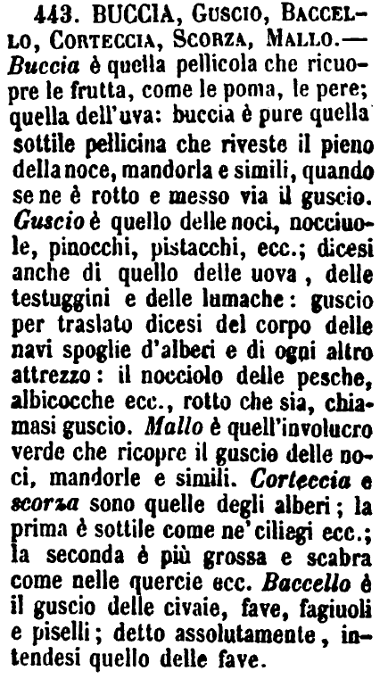 | Buccia, Guscio, Baccello, Corteccia, Scorza, Mallo - Buccia è quella pellicola che ricuopre le frutta, come le poma, le pere; quella dell'uva: buccia è pure quella sottile pellicina che riveste il pieno della noce, mandorla e simili, quando se ne è rotto e messo via il guscio. Guscio è quello delle noci, nocciuole, pinocchi, pistacchi, ecc.; dicesi anche di quello delle uova, delle testuggini e delle lumache: guscio per traslato dicesi del corpo delle navi spoglie d'alberi e di ogni altro attrezzo: il nocciolo delle pesche, albicocche ecc., rotto che sia, chiamasi guscio. Mallo è quell'involucro verde che ricopre il guscio delle noci, mandorle e simili. Corteccia e scorza sono quelle degli alberi; la prima è sottile come ne' ciliegi ecc.; la seconda è più grossa e scabra come nelle quercie ecc. Baccello è il guscio delle civaie, fave, fagiuoli e piselli; detto assolutamente, intendesi quello delle fave. [immagine] |