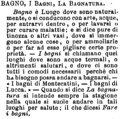 | Bagno, I bagni, La bagnatura - Bagno è il Luogo dove sono naturalmente, o si conducono con arte, acque, per entrarvi dentro, o per lavarsi o per curare malattie; e si dice pure di tinozza o altri vasi, dove si immergono alcune cose, o per ammollarle o per far ad esse pigliare certe proprietà. - I bagni si chiamano quei luoghi dove sono acque termali, o altrimenti salutari, e dove ci sono tutti i comodi necessarii perchè chi ha bisogno possa andare a bagnarsi. - «I bagni di Montecatini, - I bagni di Lucca.» - Quando si dice La bagnatura si intende sempre la stagione nella quale si suole andare in tali luoghi per salute; il che dicesi Fare i bagni. [immagine] |
