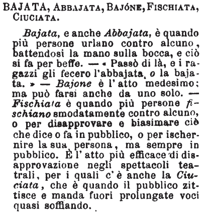 | Bajata, Abbajata, Bajone, Fischiata, Ciuciata - Bajata, e anche Abbajata, è quando più persone urlano contro alcuno, battendosi la mano sulla bocca, e ciò si fa per beffe. - «Passò di là, e i ragazzi gli fecero l'abbajata, o la bajata.» Bajone è l'atto medesimo: ma può farsi anche da uno solo. - Fischiata è quando più persone fischiano smodatamente contro alcuno, o per disapprovare e biasimare ciò che dice o fa in pubblico, o per ischernire la sua persona, ma sempre in pubblico. E' l'atto più efficace di disapprovazione negli spettacoli teatrali, per i quali c'è anche la Ciuciata, che è quando il pubblico zittisce e manda fuori prolungate voci quasi soffiando. [immagine] |
