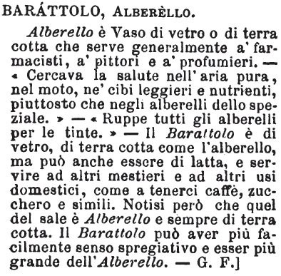 | Barattolo, Alberello - Alberello è Vaso di vetro o di terra cotta che serve generalmente a' farmacisti, a' pittori e a' profumieri. - «Cercava la salute nell'aria pura, nel moto, ne' cibi leggieri e nutrienti, piuttosto che negli alberelli dello speziale.» - «Ruppe tutti gli alberelli per le tinte.» - Il Barattolo è di vetro, di terra cotta come l'alberello, ma può anche essere di latta, e servire ad altri mestieri e ad altri usi domestici, come a tenerci caffè, zucchero e simili. Notisi però che quel del sale è Alberello e sempre di terra cotta. Il Barattolo può aver più facilmente senso spregiativo e esser più grande dell'Alberello. - G.F.] [immagine] |