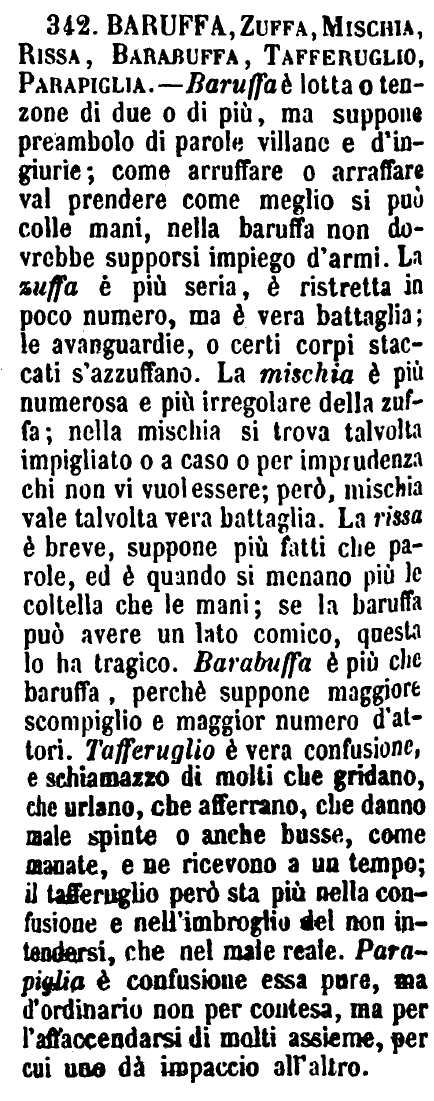 | Mischia, Zuppa, Baruffa, Rissa - Mischia s'intende per più persone che contendono insieme di parole e di fatti, e generalmente con l'armi alla mano; e si trasporta anche a significare schiere di soldati che combattono. - Zuffa è contrasto tra due schiere, armate o no, che si affrontano confusamente per offendersi a vicenda. - Baruffa è contrasto tra più persone raccolte insieme per qualsivoglia cagione, e che vengono confusamente alle mani per querele private. - Rissa è qualcosa più; e spesso vi si adopra il coltello. [immagine] |