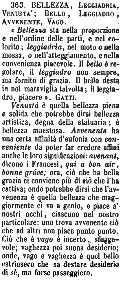 Venustà è quella bellezza piena e solida che potrebbe dirsi bellezza artistica, degna della statuaria; è bellezza maestosa. Avvenente ha una certa affinità d'eufonia con conveniente da poter far credere affini anche le loro significazioni: avenant, dicono i Francesi, qui a bon air, bonne grâce; ora, ciò che ha bella grazia ci conviene più di ciò che l'ha cattiva; onde potrebbe dirsi che l'avvenenza è quella bellezza che maggiormente ci va a genio, e piace a' nostri occhi, ciascuno nel nostro particolare: uno trova avvenente ciò che ad altri non piace punto punto. Ciò che è vago è incerto, sfuggevole; vaghezza poi suona desiderio; onde, vago e vaghezza è quel bello estrinseco che sa destare desiderio di sè, ma forse passeggiero. [immagine] |