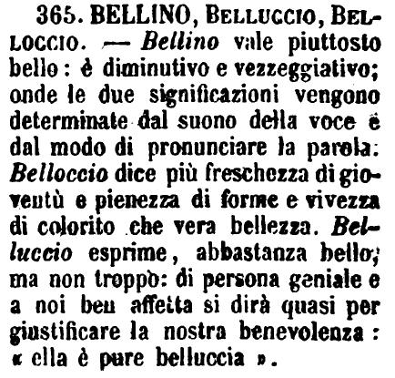 | Bellino, Belluccio, Belloccio - Bellino vale piuttosto bello: è diminutivo e vezzeggiativo; onde le due significazioni vengono determinate dal suono della voce e dal modo di pronunciare la parola. Belloccio dice più freschezza di gioventù e pienezza di forme e vivezza di colorito che vera bellezza. Belluccio esprime, abbastanza bello, ma non troppo: di persona geniale e a noi ben affetta si dirà quasi per giustificare la nostra benevolenza: «ella è pure belluccia». [immagine] |