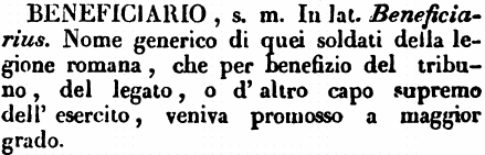 | Beneficiario - s. m. In lat. Beneficiarius. Nome generico di quei soldati della legione romana, che per benefizio del tribuno, del legato, o d'altro capo supremo dell'esercito, veniva promosso a maggior grado. [immagine] |