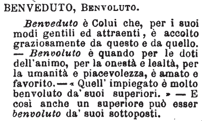 | Benveduto, Benvoluto - Benveduto è Colui che, per i suoi modi gentili ed attraenti, è accolto graziosamente da questo e da quello. -Benvoluto è quando per le doti dell'animo, per la onestà e lealtà, per la umanità e piacevolezza, è amato e favorito. - «Quell'impiegato è molto benvoluto da' suoi superiori.» - E così anche un superiore può esser benvoluto da' suoi sottoposti. [immagine] |