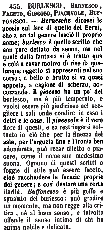 | Burlesco, Bernesco, Faceto, Giocoso, Piacevole, Buffonesco - Bernesche diconsi le poesie sul fare di quelle del Berni, che a un tal genere lasciò il proprio nome; burlesco è quello scritto che non pare dettato da senno, ma nel quale dalla fantasia si è tratto qua e colà a cavar motivo di riso da qualunque oggetto si appresenti nel suo corso; e bello e brutto si va quasi apposta, a cagione di scherzo, accozzando. Il giocoso ha un po' del burlesco, ma è più temperato, e vuolsi essere più giudicioso nel scegliere i sali onde condire in esso i detti e le cose. Il piacevole è il vero fiore di questi, e sa restringersi soltanto in ciò che per la finezza del sale, per l'arguzia fina e l'ironia ben adombrata, può recar diletto e piacere, come il nome suo medesimo suona. Ognuno di questi scritti o foggie di stile può essere faceto, cioè racchiudere le facezie proprie del genere; e così destare una certa ilarità. Buffonesco è più goffo e sguaiato del burlesco: può gradire un momento, ma non regge alla critica, né al buon senso, e talvolta offende il senso intimo di chi ha anima nobile e delicata. [immagine] |