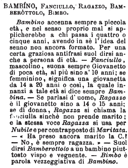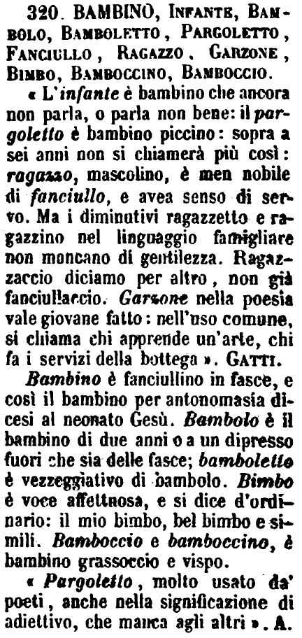 | Bambino, Infante, Bambolo, Bamboletto, Pargoletto, Fanciullo, Ragazzo, Garzone, Bimbo, Bamboccino, Bamboccio - « L'infante è bambino che ancora non parla, o parla non bene: il pargoletto è bambino piccino: sopra a sei anni non si chiamerà più così: ragazzo, mascolino, è men nobile di fanciullo, e avea senso di servo. Ma i diminutivi ragazzetto e ragazzino nel linguaggio famigliare non mancano di gentilezza. Ragazzaccio diciamo per altro, non già fanciullaccio. Garzone nella poesia vale giovane fatto: nell'uso comune, si chiama chi apprende un'arte, chi fa i servizi della bottega ». Gatti.