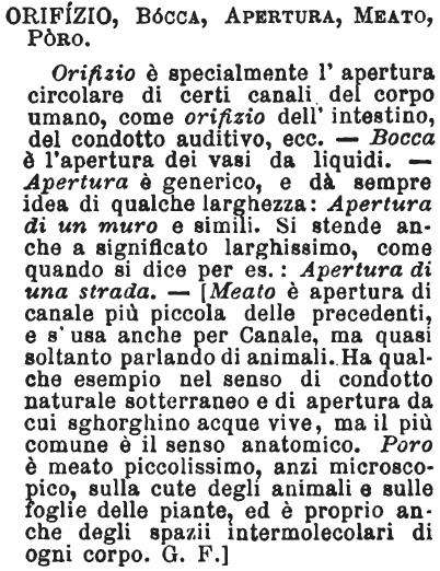 | Orifizio, Bocca, Apertura, Meato, Poro - Orifizio è specialmente l'apertura circolare di certi canali del corpo umano, come orifizio dell'intestino, del condotto auditivo, ecc. - Bocca è l'apertura dei vasi da liquidi. - Apertura è generico, e dà sempre idea di qualche larghezza: Apertura di un muro e simili. Si stende anche a significato larghissimo, come quando si dice per es.: Apertura di una strada. - [Meato è apertura di canale più piccola delle precedenti, e s'usa anche per Canale, ma quasi soltanto parlando di animali. Ha qualche esempio nel senso di condotto naturale sotterraneo e di apertura da cui sghorghino acque vive, ma il più comune è il senso anatomico. Poro è meato piccolissimo, anzi microscopico, sulla cute degli animali e sulle foglie delle piante, ed è proprio anche degli spazii intermolecolari di ogni corpo. G.F.] [immagine] |