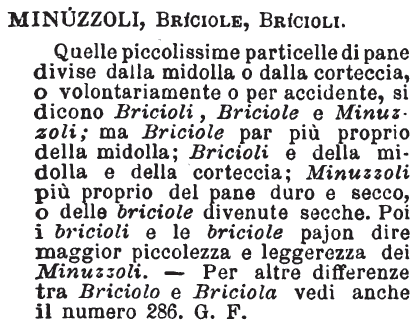 | Minuzzoli, Briciole, Bricioli - Quelle piccolissime particelle di pane divise dalla midolla o dalla corteccia, o volontariamente o per accidente, si dicono Bricioli, Briciole e Minuzzoli; ma Briciole par più proprio della midolla; Bricioli e della midolla e della corteccia; Minuzzoli più proprio del pane duro e secco, o delle briciole divenute secche. Poi i bricioli e le briciole pajon dire maggior piccolezza e leggerezza dei Minuzzoli. - Per altre differenze tra Briciolo e Briciola vedi anche il numero 286. G. F. [immagine] |