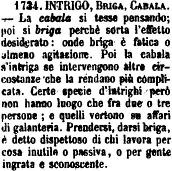 | Intrigo, Briga, Cabala - La cabala si tesse pensando; poi si briga perchè sorta l'effetto desiderato: onde briga è fatica o almeno agitazione. Poi la cabala s'intriga se intervengono altre circostanze che la rendano più complicata. Certe specie d'intrighi però non hanno luogo che fra due o tre persone; e quelli vertono su affari di galanteria. Prendersi, darsi briga, è detto dispettoso di chi lavora per cosa inutile o passiva, o per gente ingrata e sconoscente. [immagine] |