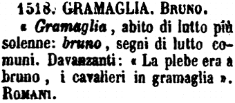 | Gramaglia, Bruno - « Gramaglia, abito di lutto più solenne: bruno, segni di lutto comuni. Davanzanti: « La plebe era a bruno, i cavalieri in gramaglia ». Romani. [immagine] |