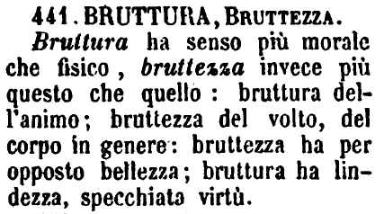 | Bruttura, Bruttezza - Bruttura ha senso più morale che fisico, bruttezza invece più questo che quello: bruttura dell'animo; bruttezza del volto, del corpo in genere: bruttezza ha per opposto bellezza; bruttura ha lindezza, specchiata virtù. [immagine] |