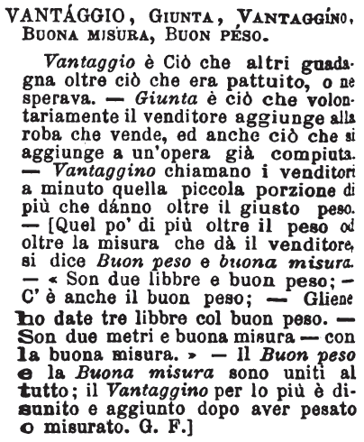 | Vantaggio, Giunta, Vantaggino, Buona misura, Buon peso - Vantaggio è Ciò che altri guadagna oltre ciò che era pattuito, o ne sperava. - Giunta è ciò che volontariamente il venditore aggiunge alla roba che vende, ed anche ciò che si aggiunge a un'opera già compiuta. - Vantaggino chiamano i venditori a minuto quella piccola porzione di più che dànno oltre il giusto peso. - [Quel po' di più oltre il peso od oltre la misura che dà il venditore, si dice Buon peso e buona misura. - «Son due libbre e buon peso; - C'è anche il buon peso; - Gliene ho date tre libbre col buon peso. - Son due metri e buona misura - con la buona misura.» - Il Buon peso e la Buona misura sono uniti al tutto; il Vantaggino per lo più è disunito e aggiunto dopo aver pesato o misurato. G. F.] [immagine] |