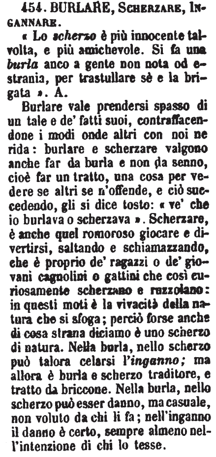 | Burlare, Scherzare, Ingannare - «Lo scherzo è più innocente talvolta, e più amichevole. Si fa una burla anco a gente non nota od estrania, per trastullare sè e la brigata». A.