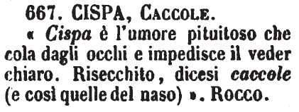 | Cispa, Caccole - « Cispa è l'umore pituitoso che cola dagli occhi e impedisce il veder chiaro. Risecchito, dicesi caccole (e così quelle del naso) ». Rocco. [immagine] |