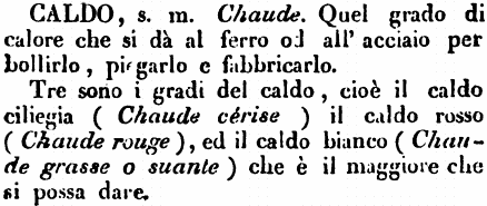 Tre sono i gradi del caldo, cioè il caldo ciliegia (Chaude cérise) il caldo rosso (Chaude rouge), ed il caldo bainco (Chaude grasse o suante) che è il maggiore che si possa dare. [immagine]