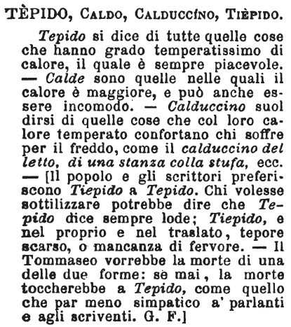 Tepido, Caldo, Calduccino, Tiepido - Tepido si dice di tutte quelle cose che hanno grado temperatissimo di calore, il quale è sempre piacevole. - Calde sono quelle nelle quali il calore è maggiore, e può anche essere incomodo. - Calduccino suol dirsi di quelle cose che col loro calore temperato confortano chi soffre per il freddo, come il calduccino del letto, di una stanza colla stufa, ecc. - [Il popolo e gli scrittori preferiscono Tiepido a Tepido. Chi volesse sottilizzare potrebbe dire che Tepido dice sempre lode; Tiepido, e nel proprio e nel traslato, tepore scarso, o mancanza di fervore. - Il Tommaseo vorrebbe la morte di una delle due forme: se mai, la morte toccherebbe a Tepido, come quello che par meno simpatico a' parlanti e agli scriventi. G. F.] [immagine]
